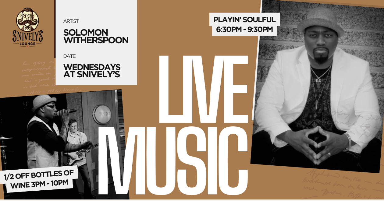 Join us every Wednesday night for a special performance with the soulful Solomon Witherspoon at Snively’s Lounge! Our specials include ½ off Bottles of Wine!